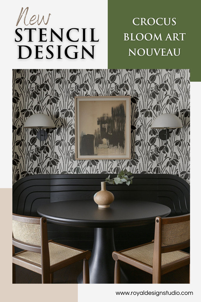 Art Nouveau pattern appreciation is having a Renaissance and we are so happy for that because we just love the organic, flowing look of this Crocus Bloom Stencil. The crocus flower is a popular theme in Art Nouveau design, and it works so well in today's interiors that call for a more modern floral motif.