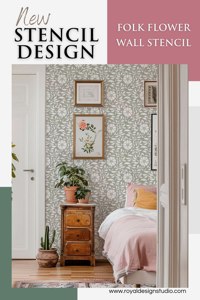 The ultimate Cottage Core wall stencil pattern for romantic rooms is here! A pretty floral spray is enclosed in an undulating garland leaf to create a cozy, casual stripe look. This stencil design reminds us of detailed embroidery and it looks super sweet stenciled on pastel painted walls