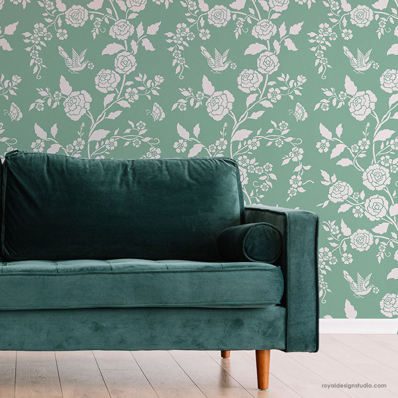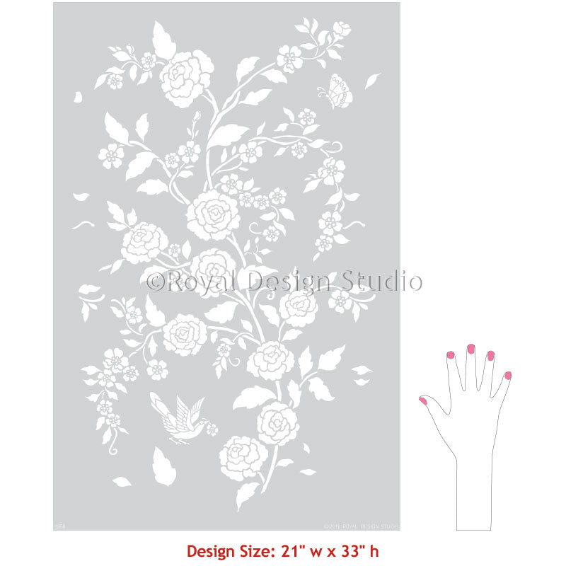 Chinoiserie, a French term, signifying "Chinese-esque", was a popular European decorative style from the the seventeenth century, and particularly popular in wallpaper designs. Characterized by asymmetrical designs and whimsical contrasts of scale, the designs often imitated Chinese porcelain patterns. Paint the gorgeous Meandering Rose Chinoiserie Wall Stencil on your bedroom walls for a classic and timeless look.