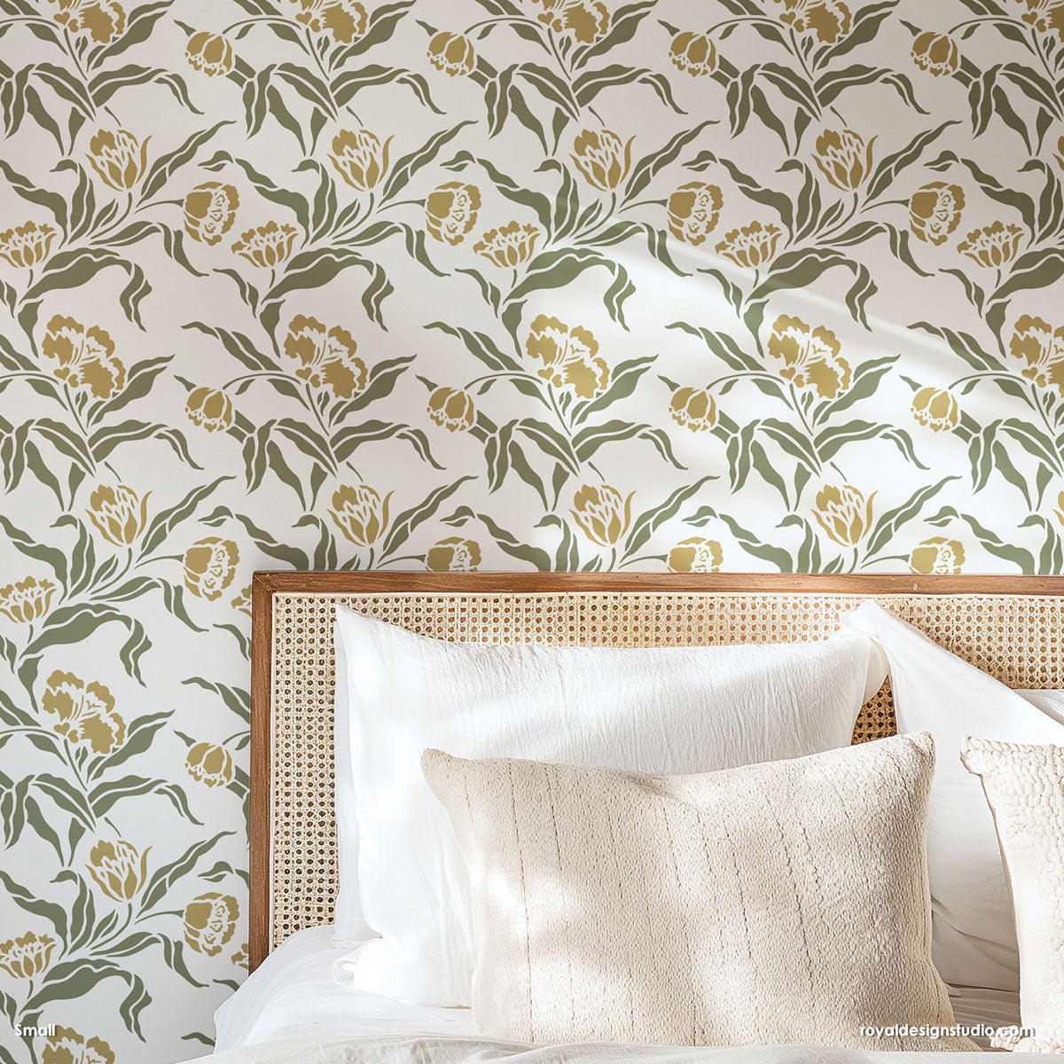 Add a dreamy floral wall pattern to your bedroom, bath, or nursery The flowers and leaves of the Phoebe's Tulip Wall Stencil gives any wall a natural looking wallpaper effect - without ruining your walls! Our large wall stencil version is perfect for adding a dramatic look and the smaller scale stencil is great for a cottage feel.