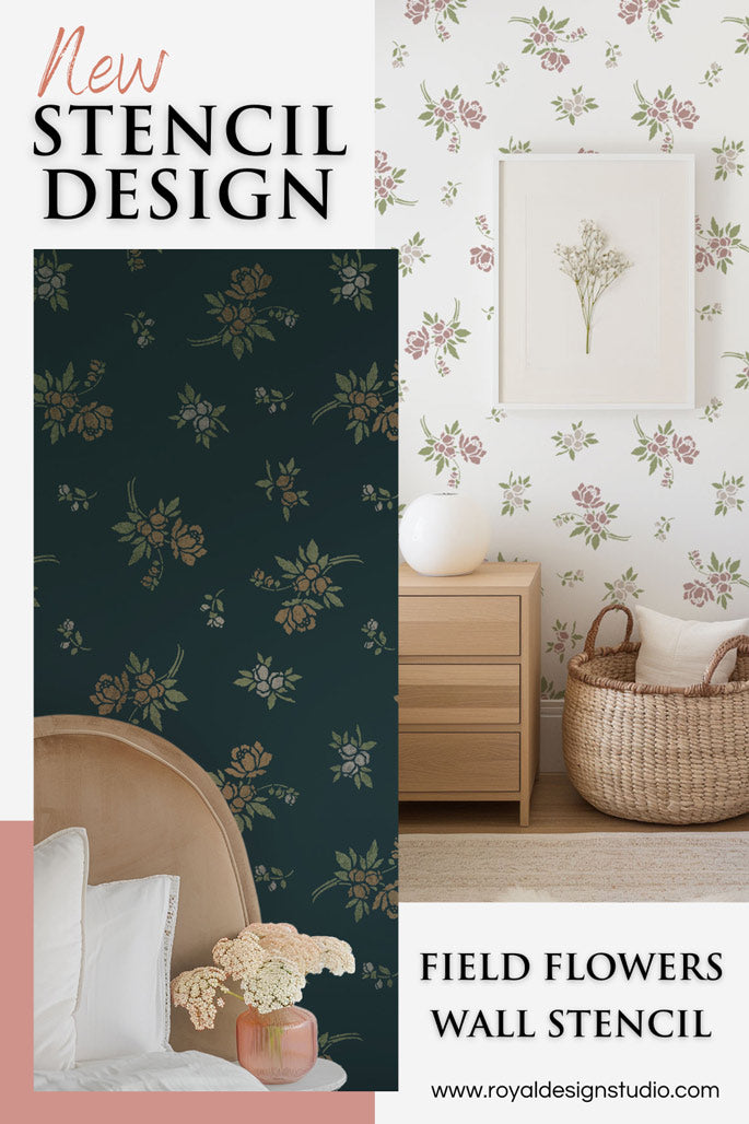 This new allover floral wall stencil design is just a sweet as can be! The scattered flower sprays bring a fresh spring and summer feel to any room, but we think this stencil is perfect for little and big girl's rooms especially!