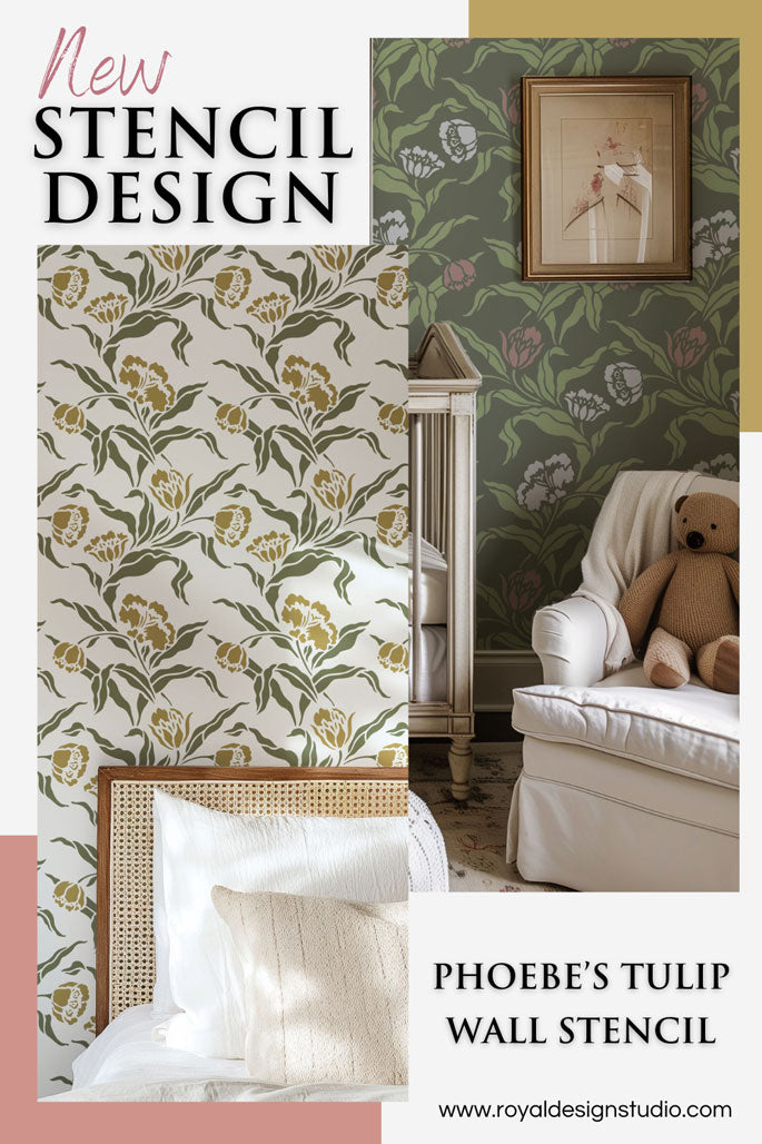 A romantic floral wall stencil that looks fresh from the garden. This graceful tulip looks fabulous stenciled in multiple colors with a little stencil shading detail added. Click to see all the new looks!